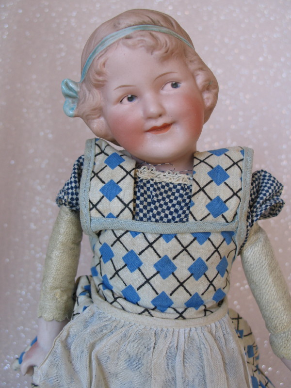 Bisque Gebruder Heubach “Coquette” 7850 11″ (28cm). Tilted head c1912 with deep molded hair, and molded blue headband with bow. Intaglio blue eyes, open closed mouth with modeled white space. Kid leather gusset jointed body with left ankle split, and bisque forearms. Blue-white pattern dress, white apron, and black shoes.
