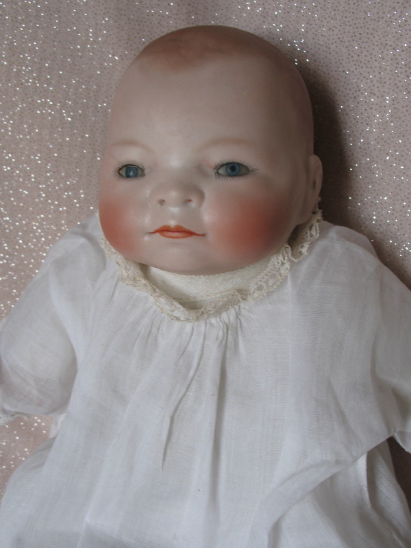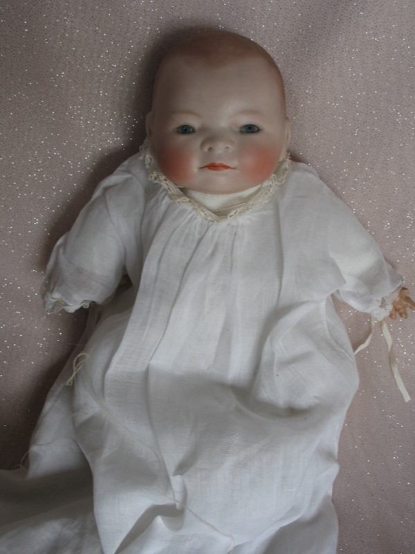 Lot 212. Grace Putnum J.D. Kestner Bye-Lo Baby ” (13cm). Bisque swivel head, cloth kapok fill frog body, celluloid hands. Tiny blue glass sleep eyes, angled lashes, russet brows. Dome head with brown sprayed hair, wide closed mouth with long centerline. White cotton baby sleepwear.