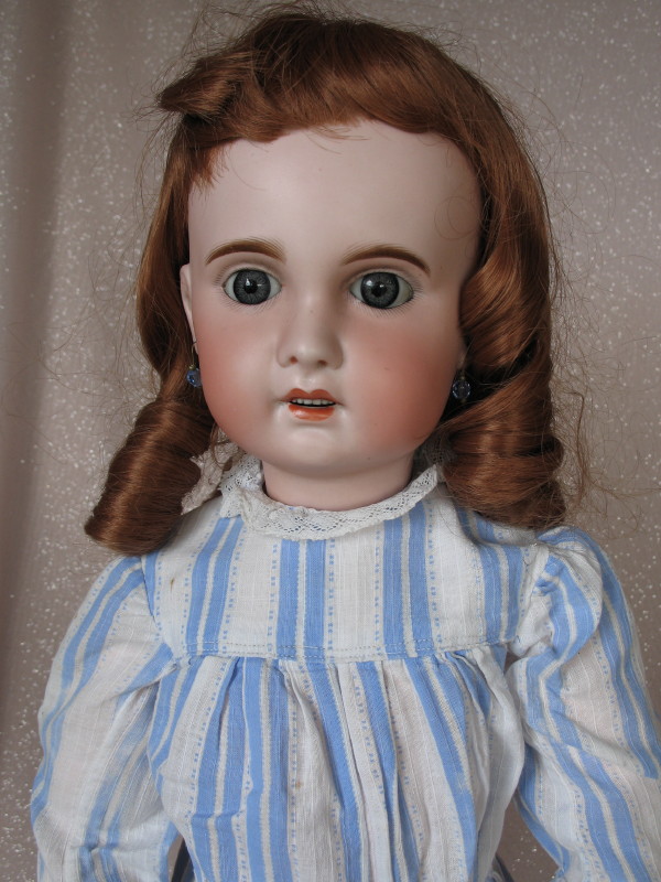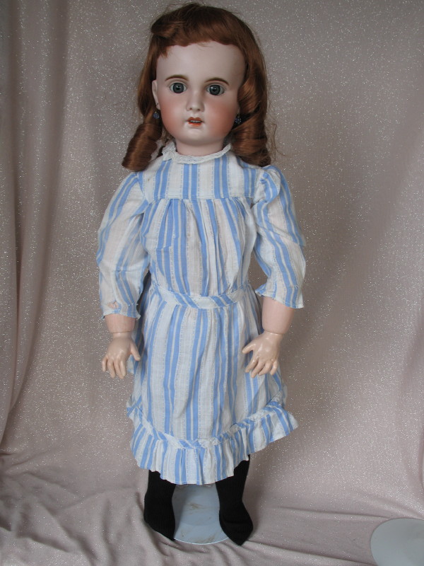 French S.F.B.J. Child 26″ (66 cm) bisque, incised SFBJ/Paris. Fixed blue glass eyes, feathered brows, angled lashes, red open mouth with peak accents, row of upper teeth. Red-brown curl replaced wig/pate, pierced ears with blue drop earrings. French ball jointed composition body with repainted hands/toes. Cotton blue stripe dress, pantaloons, and black socks. $350 – $450