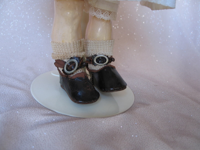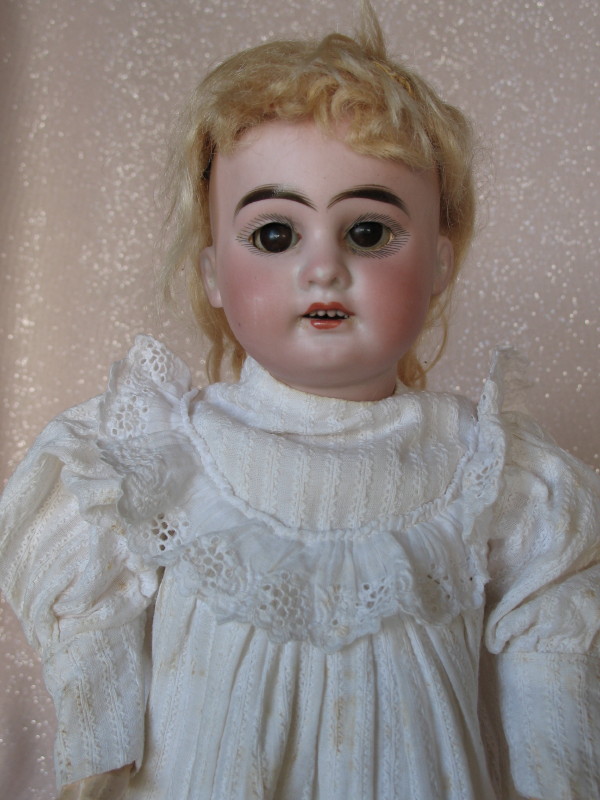 Lot 218. German Armand Marseille 1894 Dep 16” (41cm) bisque doll c1890s. Brown glass sleep eyes, angled lashes, lush gloss feathered brows. Pink open mouth with four upper teeth. Original blond mohair wig/pate. Ball jointed wood composition body with elongated upper legs. Vintage heavy cotton dress with lace collar trim, undergarments, cream socks, and Antique brown leather shoes. $150 – $200