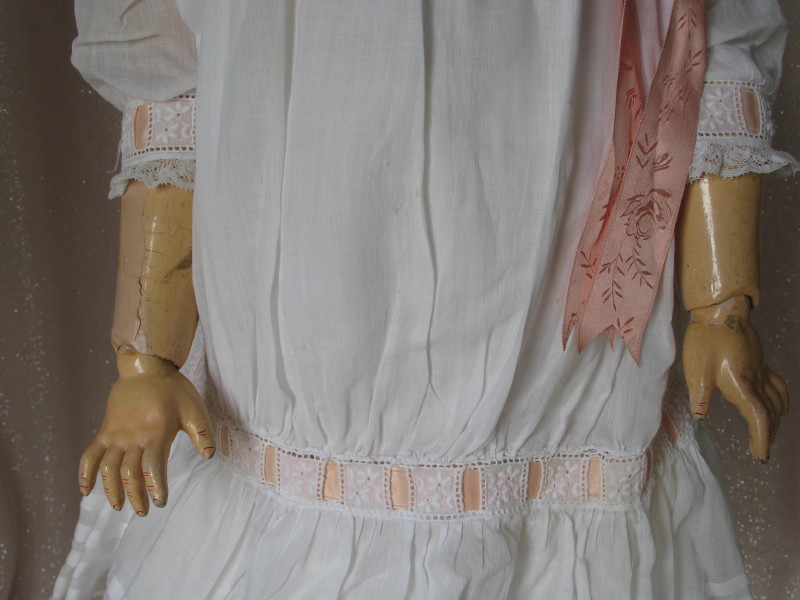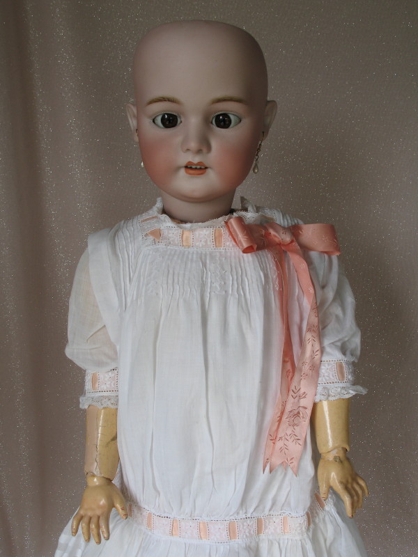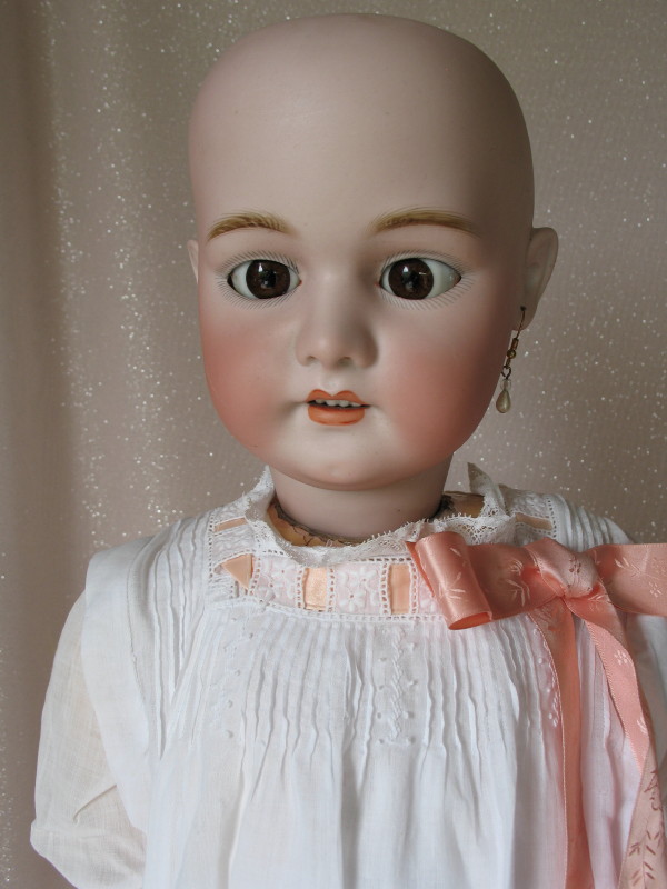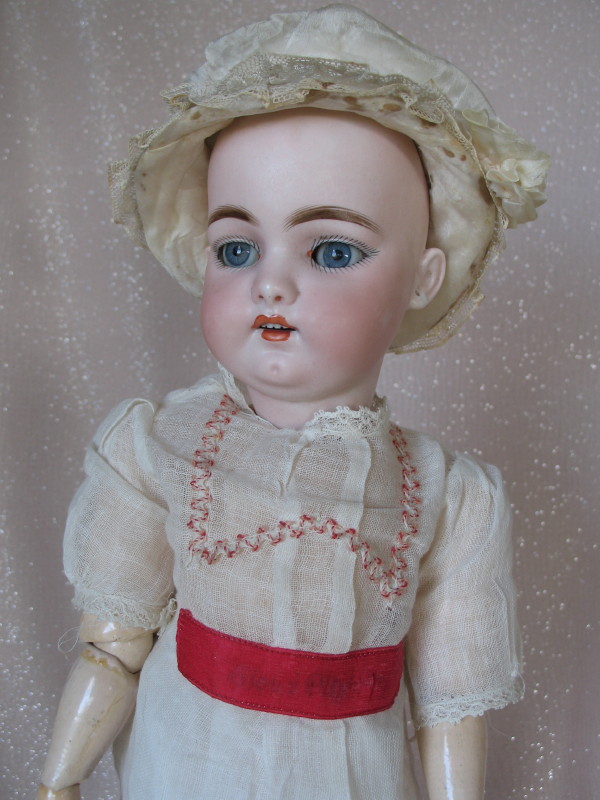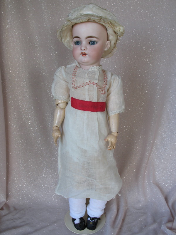 Lot 239. Bisque Simon & Halbig 1079 character child 20″ (51cm) c1890s. Short hairline from back pate rim. Antique blue glass replaced partially sleeping eyes, angled lashes, feathered brows. Open gloss red mouth and accents, upper teeth, and pierced ears. Composition ball jointed body, no wig/pate, and vintage white silk hat. Original Sonnenberg cotton chemise, socks, and black shoes. $150 – $200