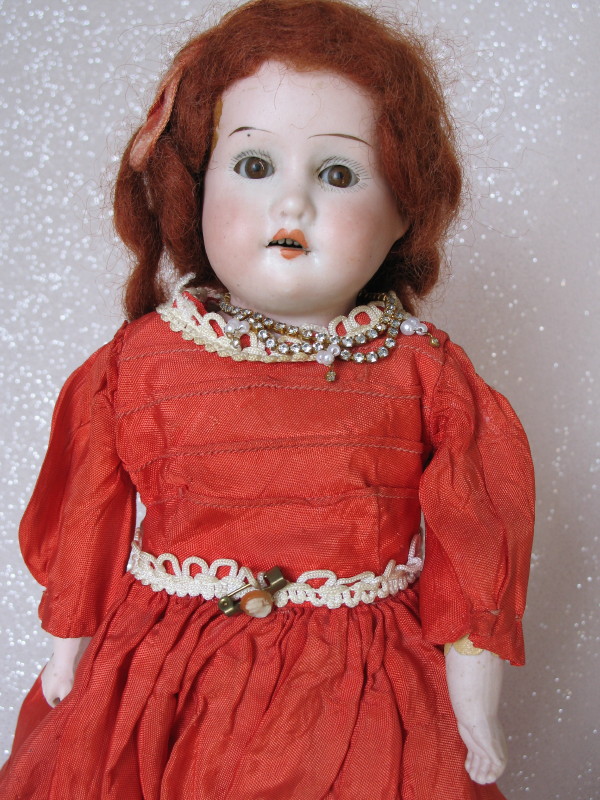 Bisque Ernst Heubach 250 shoulderhead 30cm c1914. Fixed brown eyes, open mouth with teeth, applied red mohair wig, Rivet jointed body , long red dress.